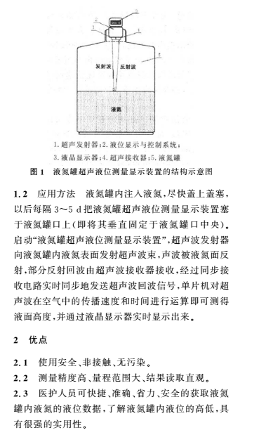 冷冻疗法是一种治疗疾病的常用方法,临床主 要用以治疗体表的良性或恶性肿物,如疣、黑痣、小 血管瘤、息肉以及宫颈糜烂等。液氮为无色、无臭、 无味的液体,沸点为-196℃,被广泛的应用于冻存 细胞及皮科、妇科、神经外科等临床医学领域。液氮 罐是液氮存储和运输的必要设备,液氮在罐内会有 自然消耗。因此,定期检查液氮损耗是经常要做的 工作,若罐内液氮容量不足总容量的 / 时,应及时 13 补充液氮。目前常用的液氮容量检查方法有两种, 一是测量法,取一根长80cm 的木棍,去皮后涂上黑 色,然后自一端开始每隔5cm 设一刻度,测量时,将 零刻度朝下,自液氮罐口插到罐底,经5~10s取 出,结霜的长度即为罐内液氮的液位,此方法既不安 全,读数误差又大;二是测重法,先称出空罐的重量, 再称出注满液氮时的重量,然后减去空罐的重量,即 得罐内液氮的总重量,以后每隔3~5d称一次液氮 罐的重量,这种方法存在费时、费力的弊端。为此, 我们自制了“液氮罐超声液位测量显示装置”,经临 床实践,取得了良好的效果。 1 制作与应用 1.1 制作方法 液氮罐超声液位测量显示装置,由超声波发射器、液位显示与控制系统、液晶显示器、超声波接收器组成。液位显示与控制系统由超声发射电路、同步接收电路、单片机连接构成。其外形为瓶塞状,且适于垂直固定于液氮罐口中央(图1)。