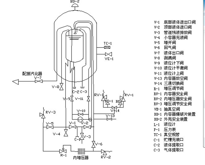 2.1.7在充灌液体期间,应注意贮槽压力表P-1。若贮槽内容器压力上升至超过供液压力或接近贮槽的正常工作压力,应打开内容器放空阀V-13,使贮槽放气泄压。