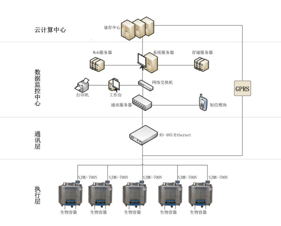 1、液氮罐监控:实时采集低位、高位温度,检测液位高度;根据液位值和温度值自动开关进液电磁阀;发送报警信息。
