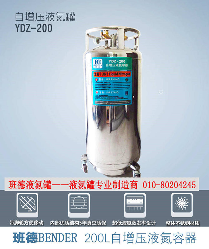 液氮罐并通过液氮的自然特性实现其使用的特殊方法的专用液氮容器。液氮是一种无色无味、、温度极低的物质,常压下,其温度为-196℃,自增压液氮罐的使用和工作原理就是利用了液氮的常压挥发性这一重要物理特性及气液相转化的特性来达到其常规使用的目的的。常规使用打开自增压液氮罐的增压阀门,少量液氮会通过增压盘管少量汽化增加罐内压力。